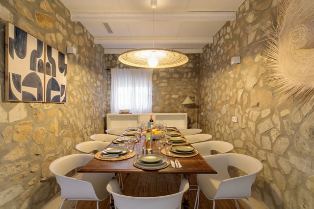 Das Erdgeschoss verfügt über eine weitere überdachte Terrasse, eine großzügige Küche, ein Esszimmer sowie drei Schlafzimmer (Betten: 150 x 200 cm, 135 x 190 cm, 180 x 200 cm) und zwei Badezimmer, eines davon en suite. Auf Anfrage können bis zu zwei zusätzliche Einzelbetten gegen einen Aufpreis von 90 € pro Einheit und Aufenthalt bereitgestellt werden.