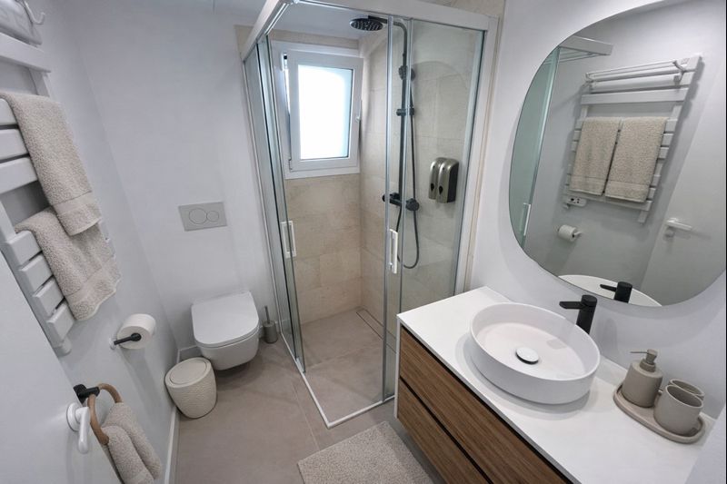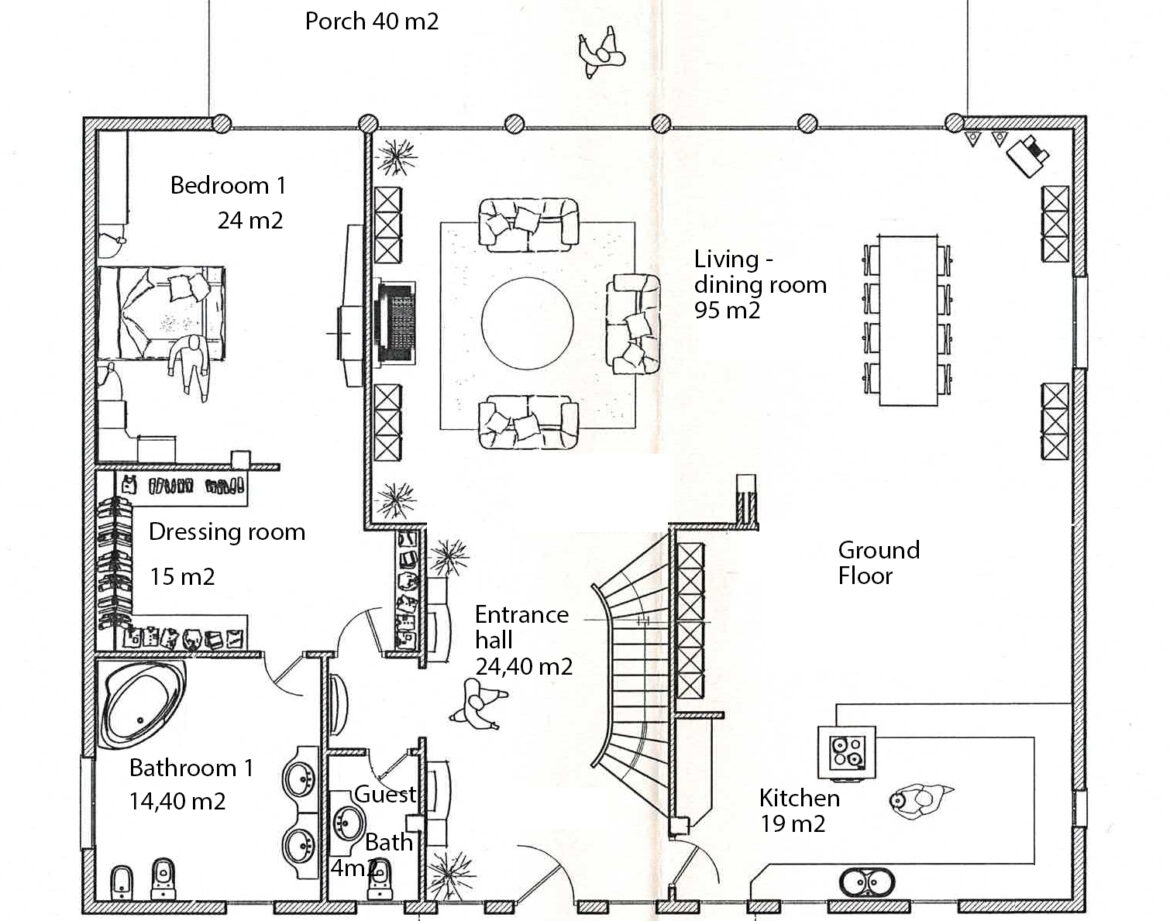 Al entrar en la villa, encontrará en la planta baja la entrada, el amplio salón – comedor con cocina americana, aseo de invitados, un dormitorio con baño en suite con una cama de 200x200cm, y una gran terraza cubierta con acceso directo a la cocina exterior cubierta y al comedor con Barbacoa y zona de piscina.