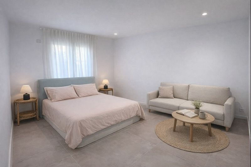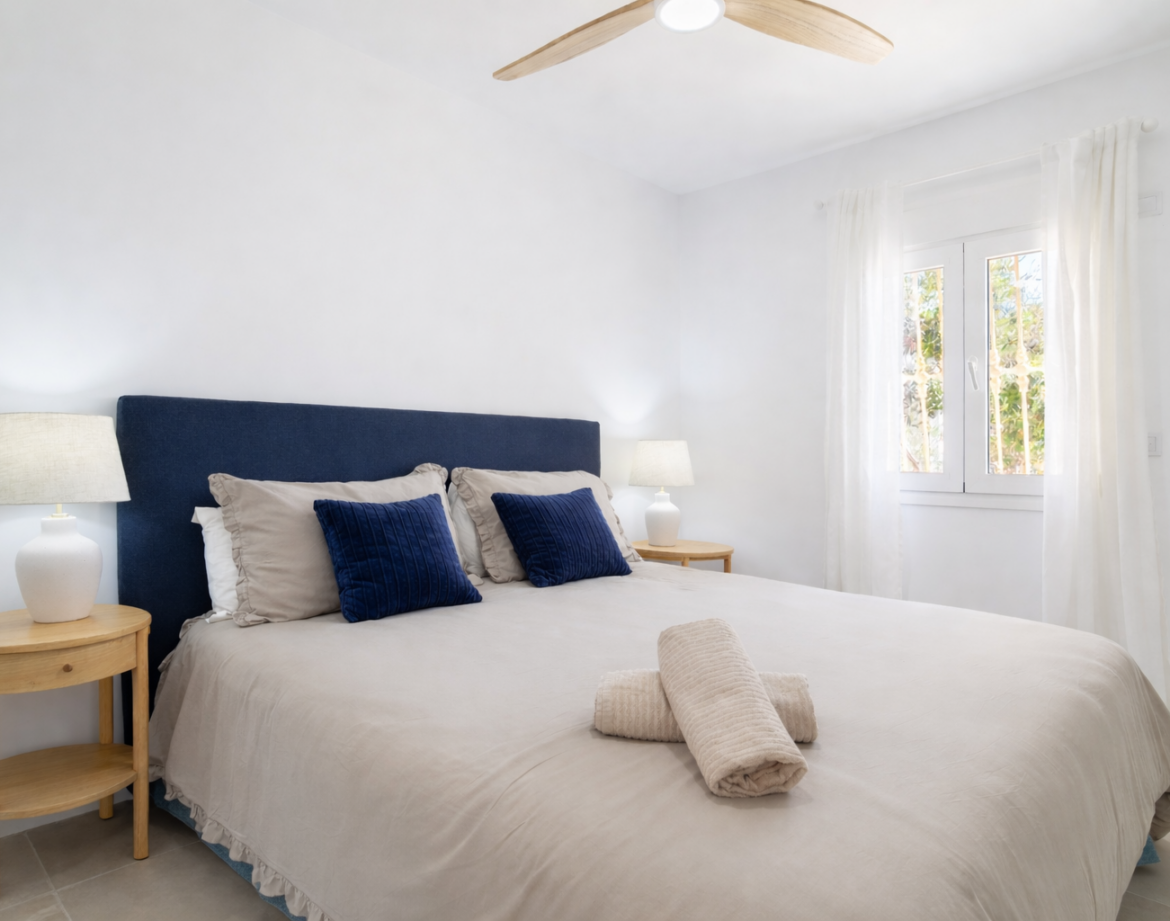 En el primer piso hay 3 amplios dormitorios con baños en suite en los cuales hay una cama de matriminio de 150x200cm, 160x200cm, 150x190cm y dos de 90x190cm y en el segundo piso se encuentra una agradable sala de estar con una gran terraza, perfecta para relajarse.