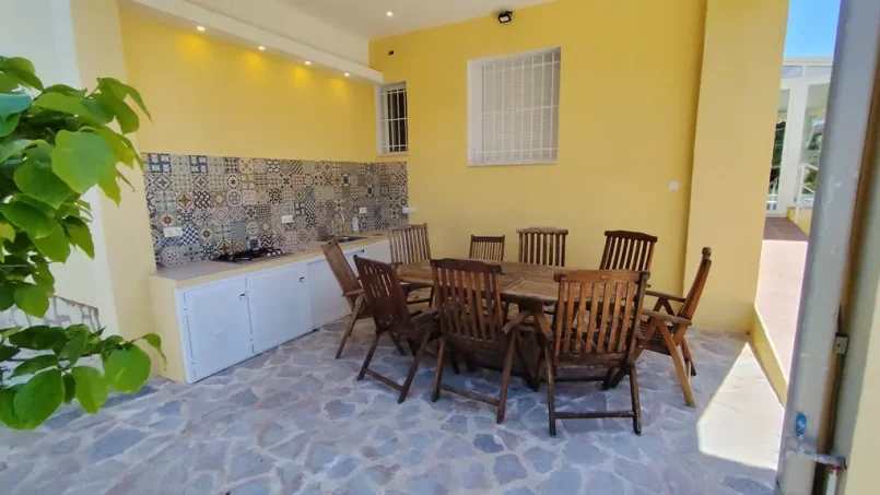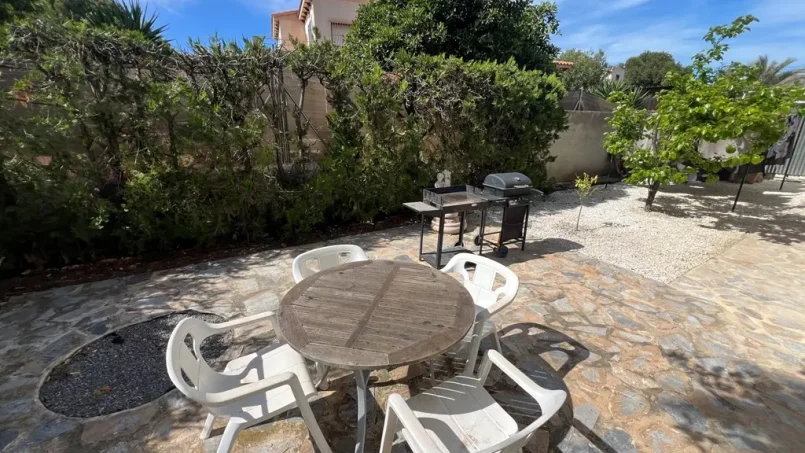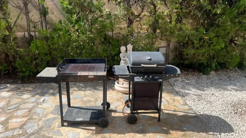 La terraza junto a la cocina exterior es el lugar perfecto para comer al aire libre y es ideal para hacer barbacoas. La casa cuenta con parrilla a gas y leña.