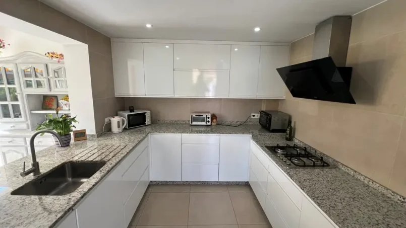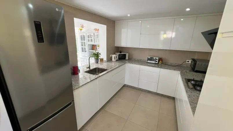Además cuenta con una moderna cocina y un salón con acceso a un porche, desde este porche se goza de unas vistas hermosas a la piscina y ofrece un ambiente acogedor y relajante.