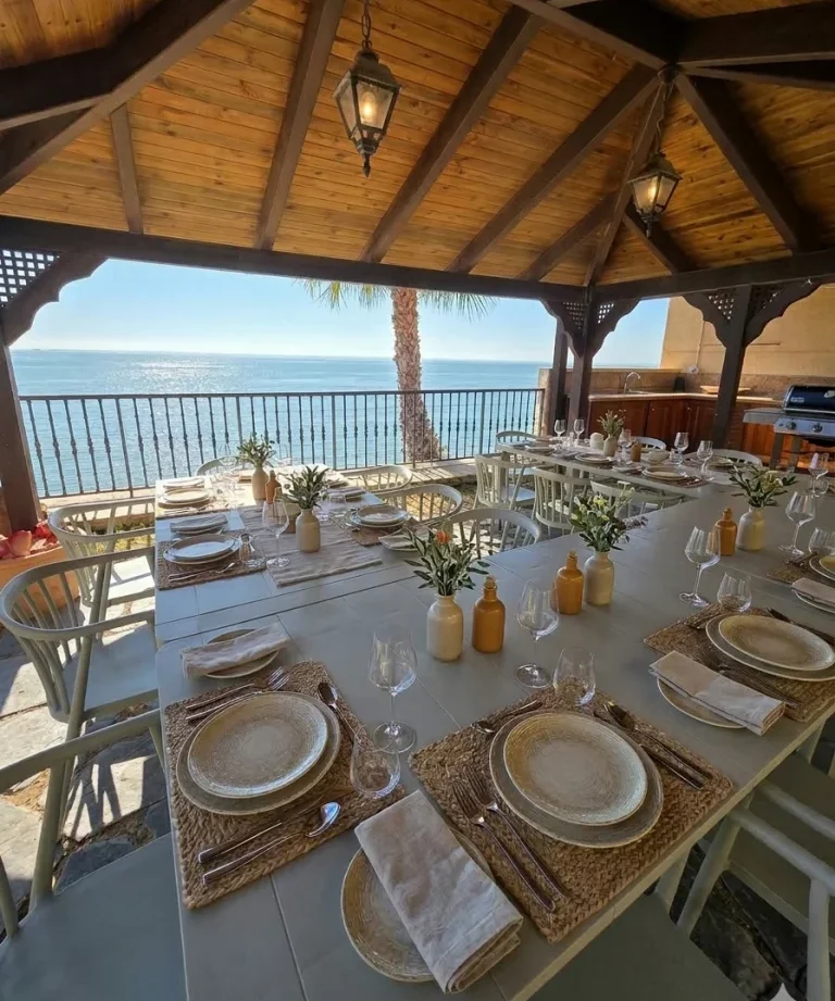 Al entrar en la Villa Leandro, encontrará en la planta baja la entrada, el amplio salón – comedor con cocina americana, aseo de invitados, un dormitorio con baño en suite con una cama de 200x200cm, y una gran terraza cubierta con acceso directo a la cocina exterior cubierta y al comedor con Barbacoa y zona de piscina.